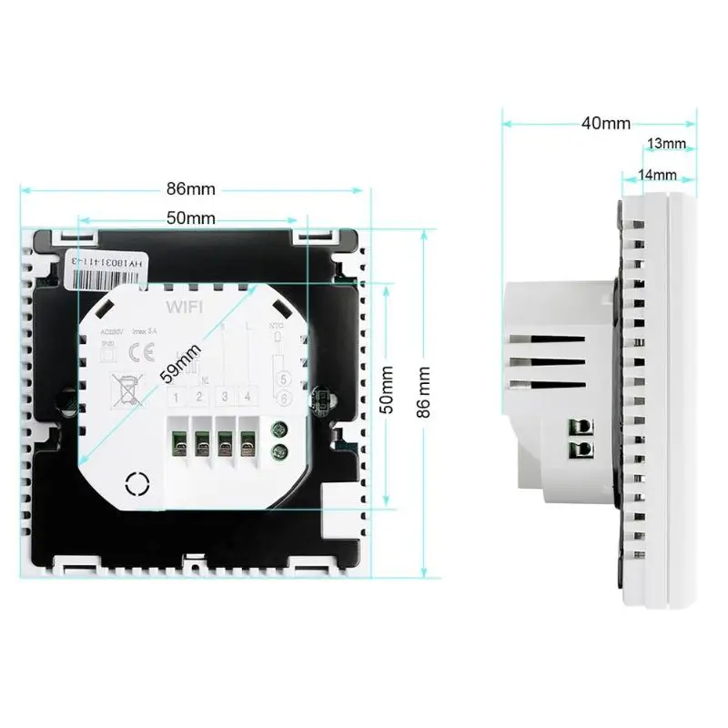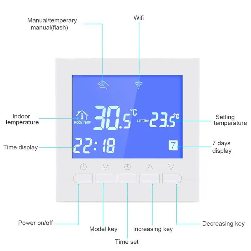 Poraba energije: <0,3 W Napajanje: AC220 ~ 240V 50 / 60Hz Obremenitveni tok: 3A (vodno talno ogrevanje), 16A (električno ogrevanje) Območje nastavitve temperature: 5 ℃ ~ 35 ℃ Omejeni temperaturni razpon: 5 ℃ ~ 99 ℃ Opombe: 1. Primerno samo za evropski trg. 2. Zaradi drugačnega monitorja in svetlobnega učinka se lahko dejanska barva izdelka nekoliko razlikuje od barve, prikazane na slikah. v paketu dobite: 1 X termostat 2 X pritrdilni vijaki 1 X uporabniški priročnik